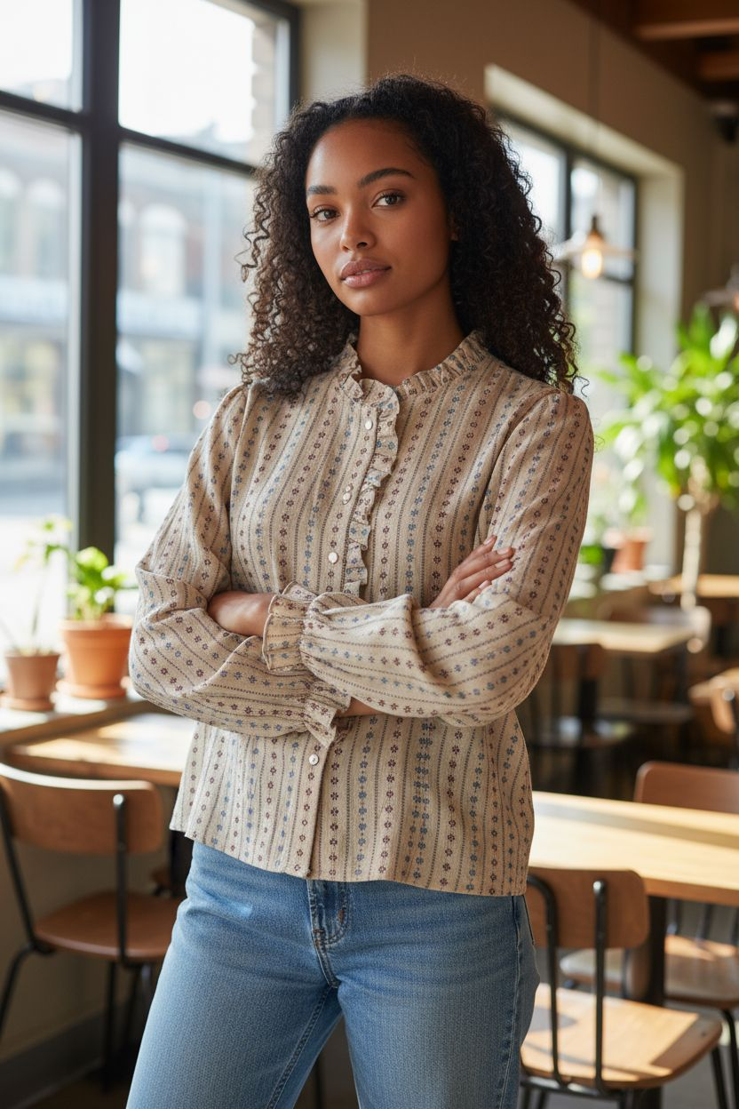 Col volanté, boutons recouverts, manches longues à poignets froncés.
