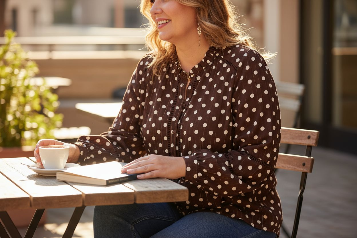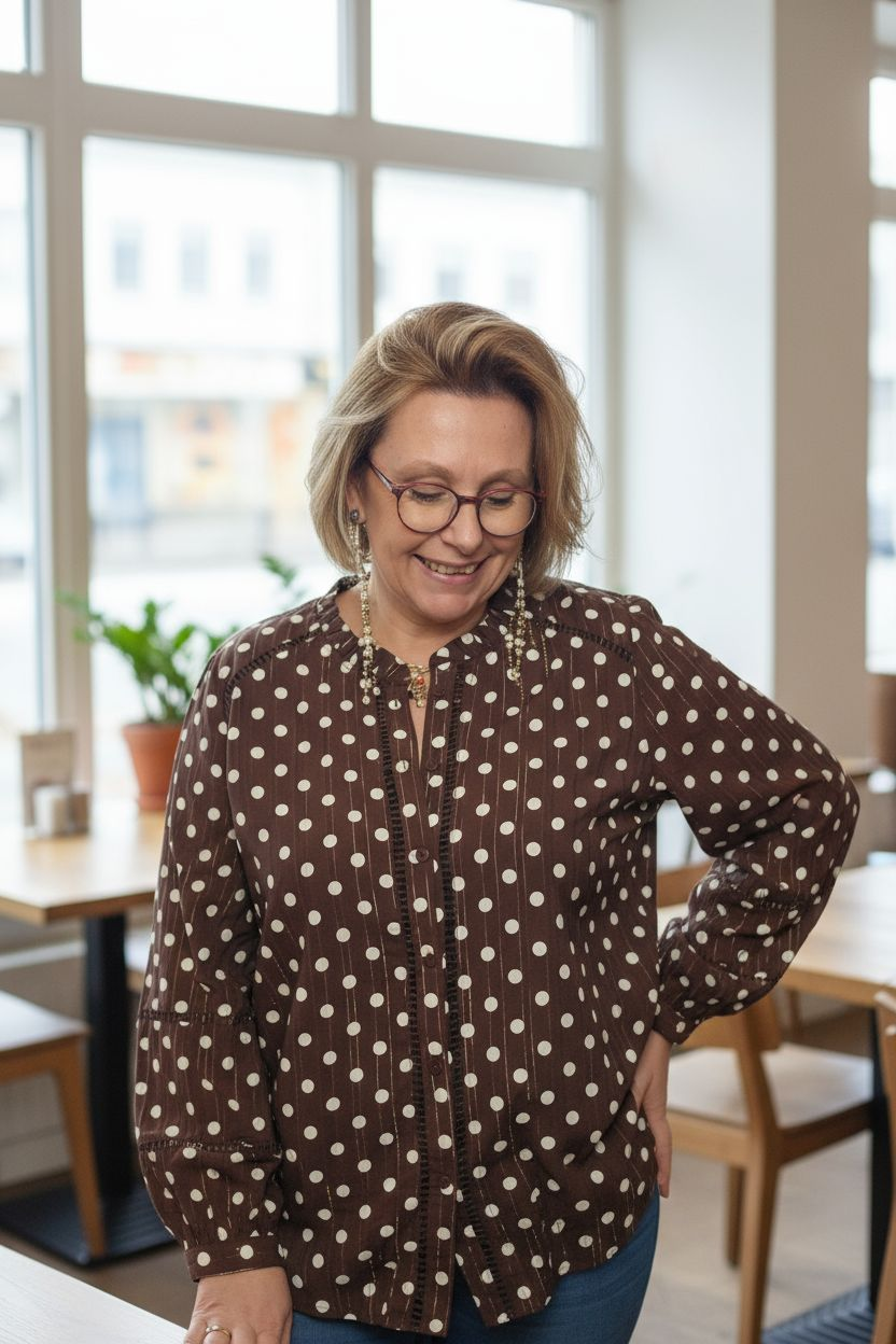 Cette chemise fluide combine le charme rétro des pois avec une touche lumineuse grâce à ses fines rayures dorées.