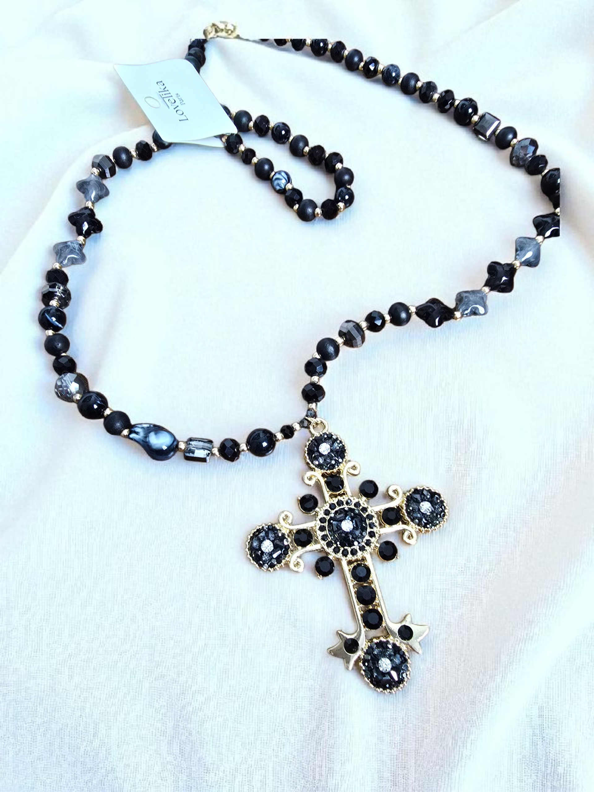 - ⚫ Noir : perles sombres et croix dorée ornée de strass noirs, pour une allure rock et sophistiquée