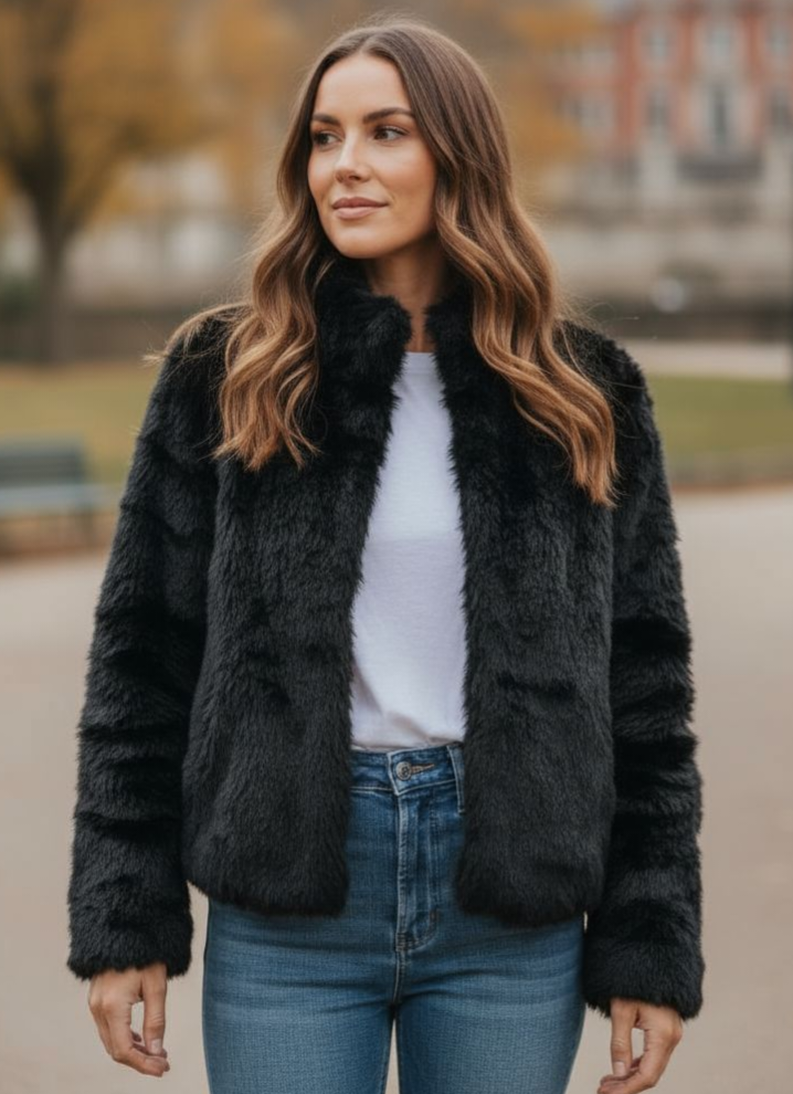 Cette veste en fausse fourrure est votre alliée pour les balades automnales et les moments cocooning.