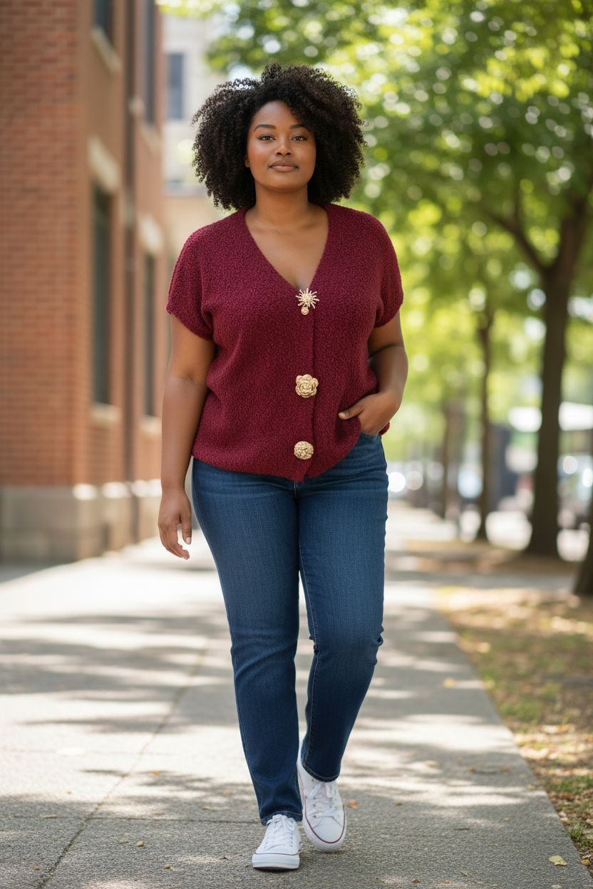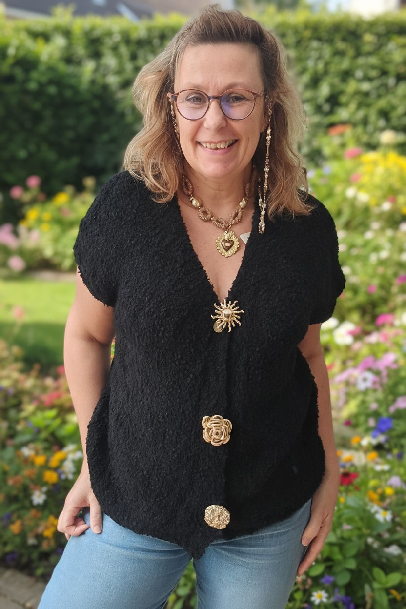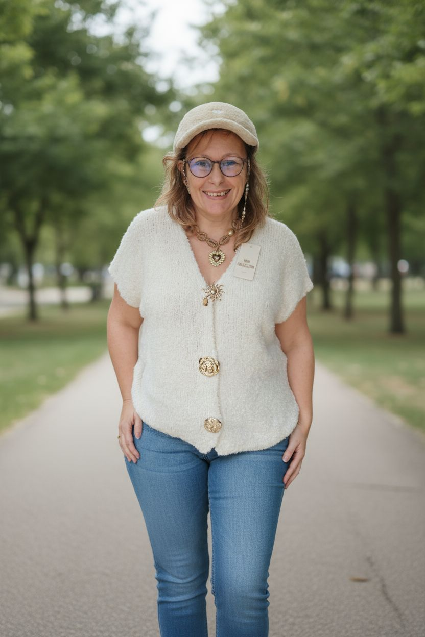 Le gilet Moumoute est fabriqué en Italie. Il est composé de 9 % de laine, 9 % de viscose, 55 % d'acrylique et 17 % de polyamide. Les boutons sont cachés par des broches. La longueur du gilet est de 67 cm. Disponible en tailles 46 et