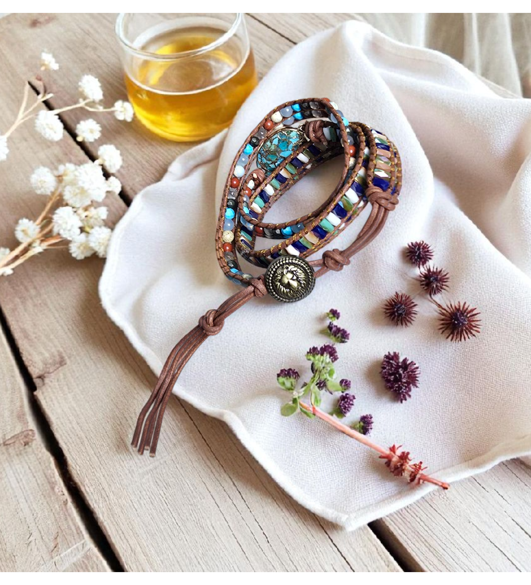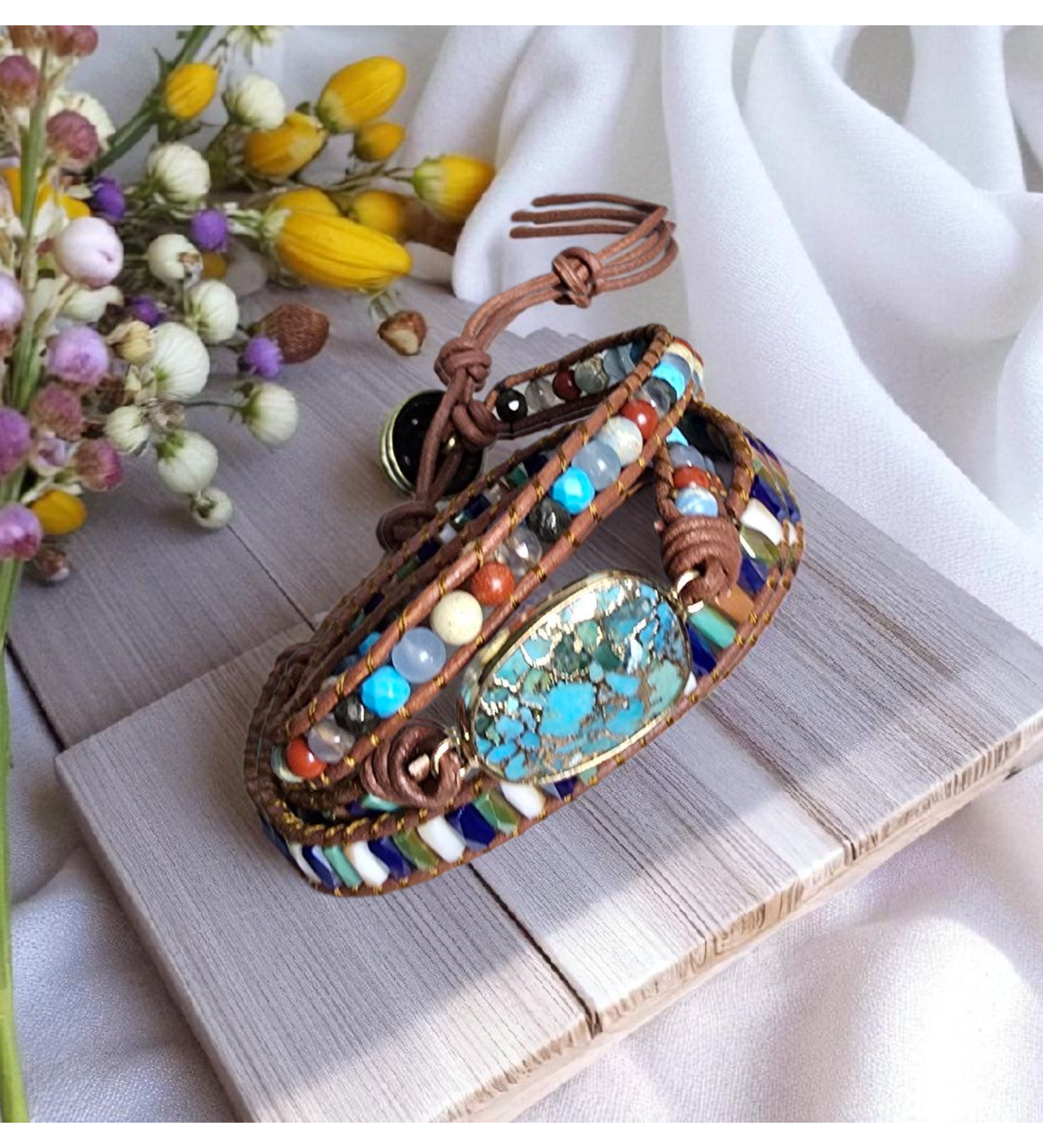 Ce bracelet multi-tours incarne l’esprit bohème avec une touche d’élégance brute. Fabriqué à la main avec des matériaux naturels, il associe une pierre centrale en turquoise à des perles colorées et un cordon en cuir véritable. Chaque pièce est unique, conçue avec soin pour sublimer votre style au quotidien.
