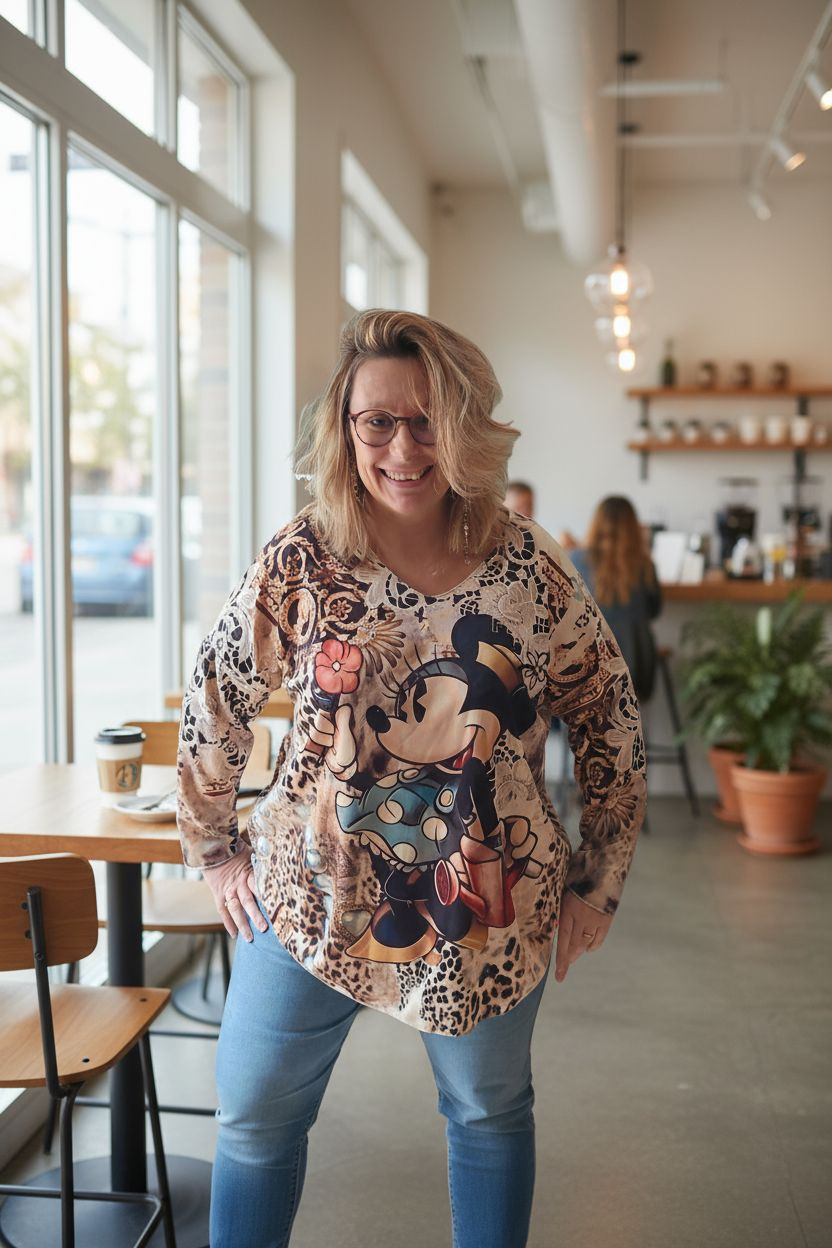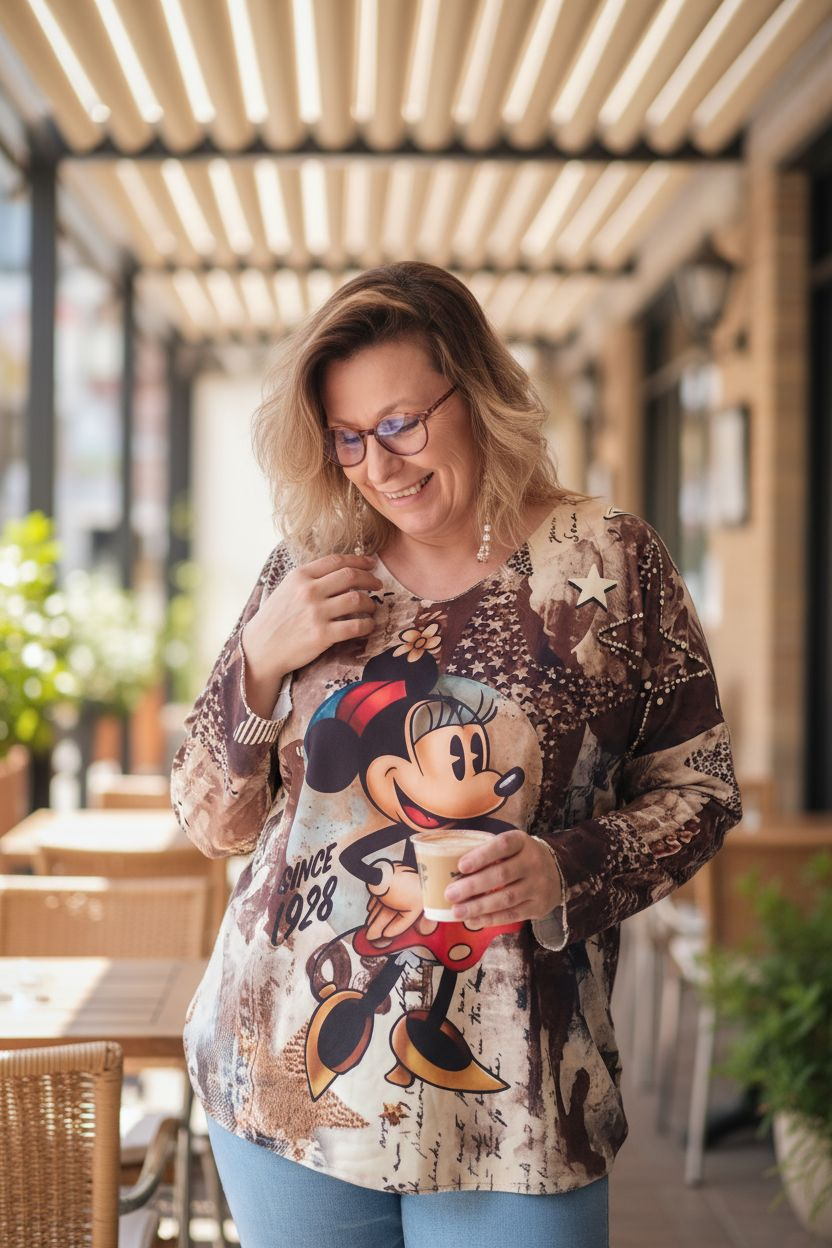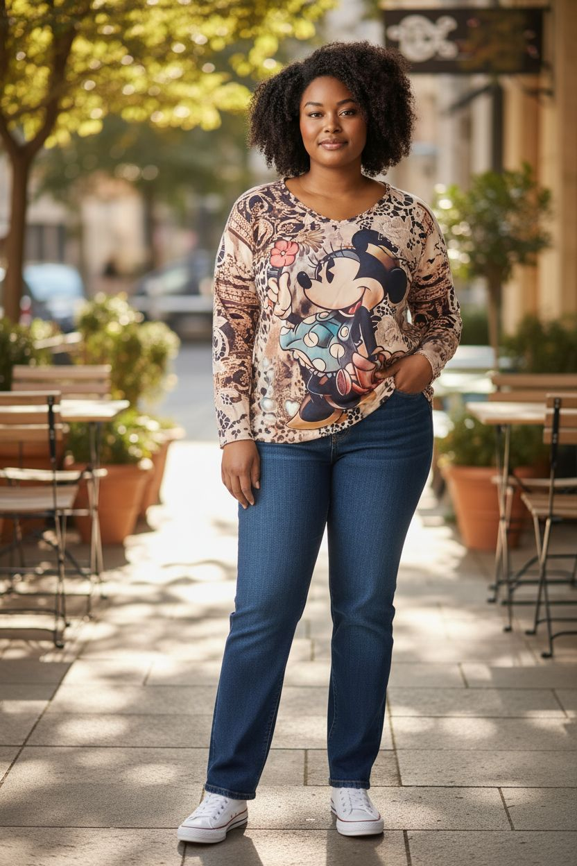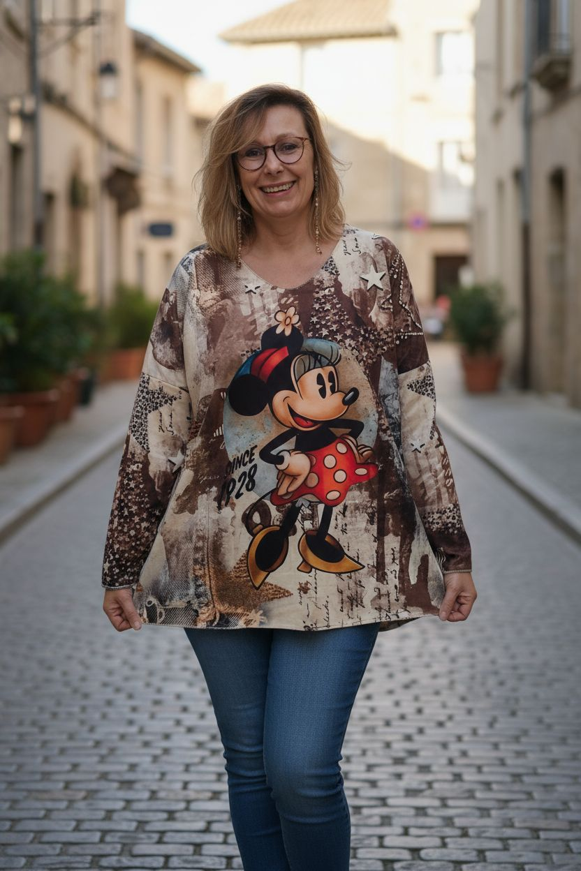 Ce top Minnie est bien plus qu’un simple vêtement : c’est une pièce audacieuse qui allie style graphique, matières douces, et confort italien. Voici ce qui le rend irrésistible :