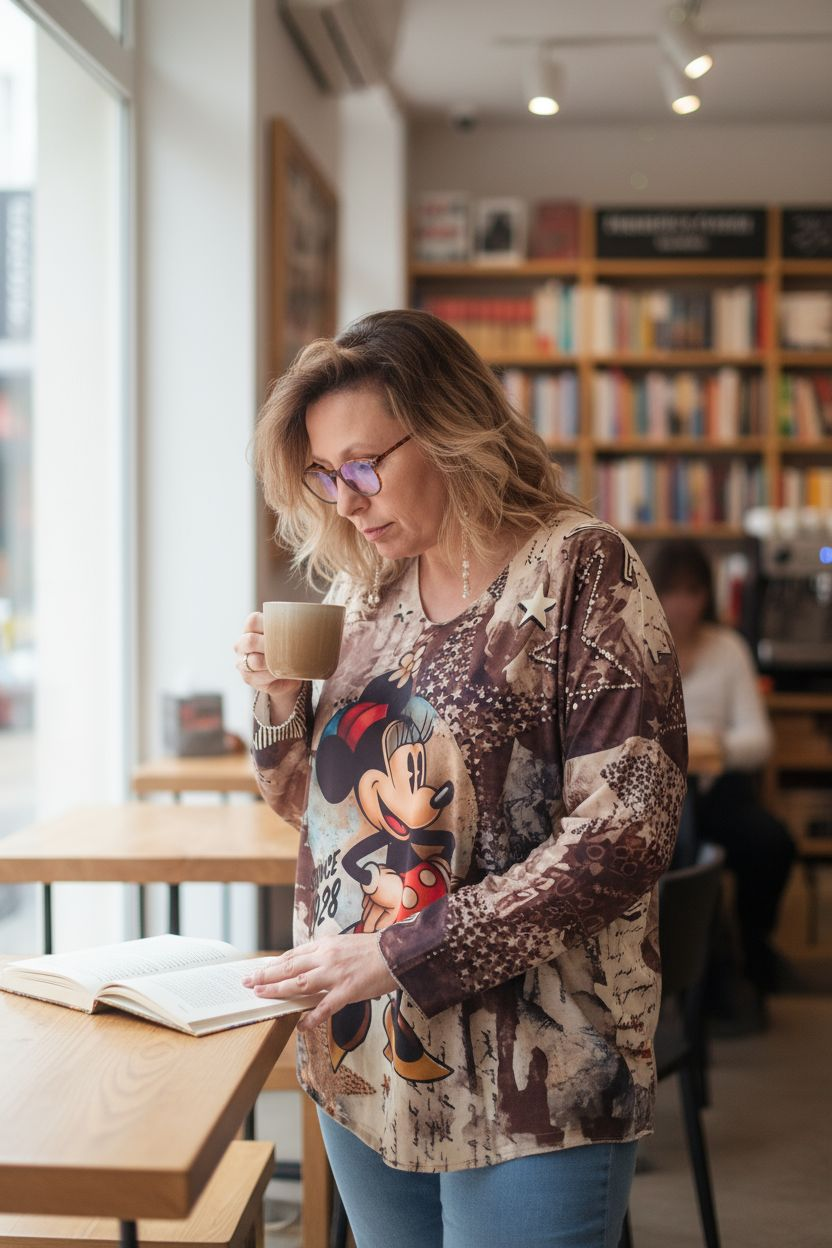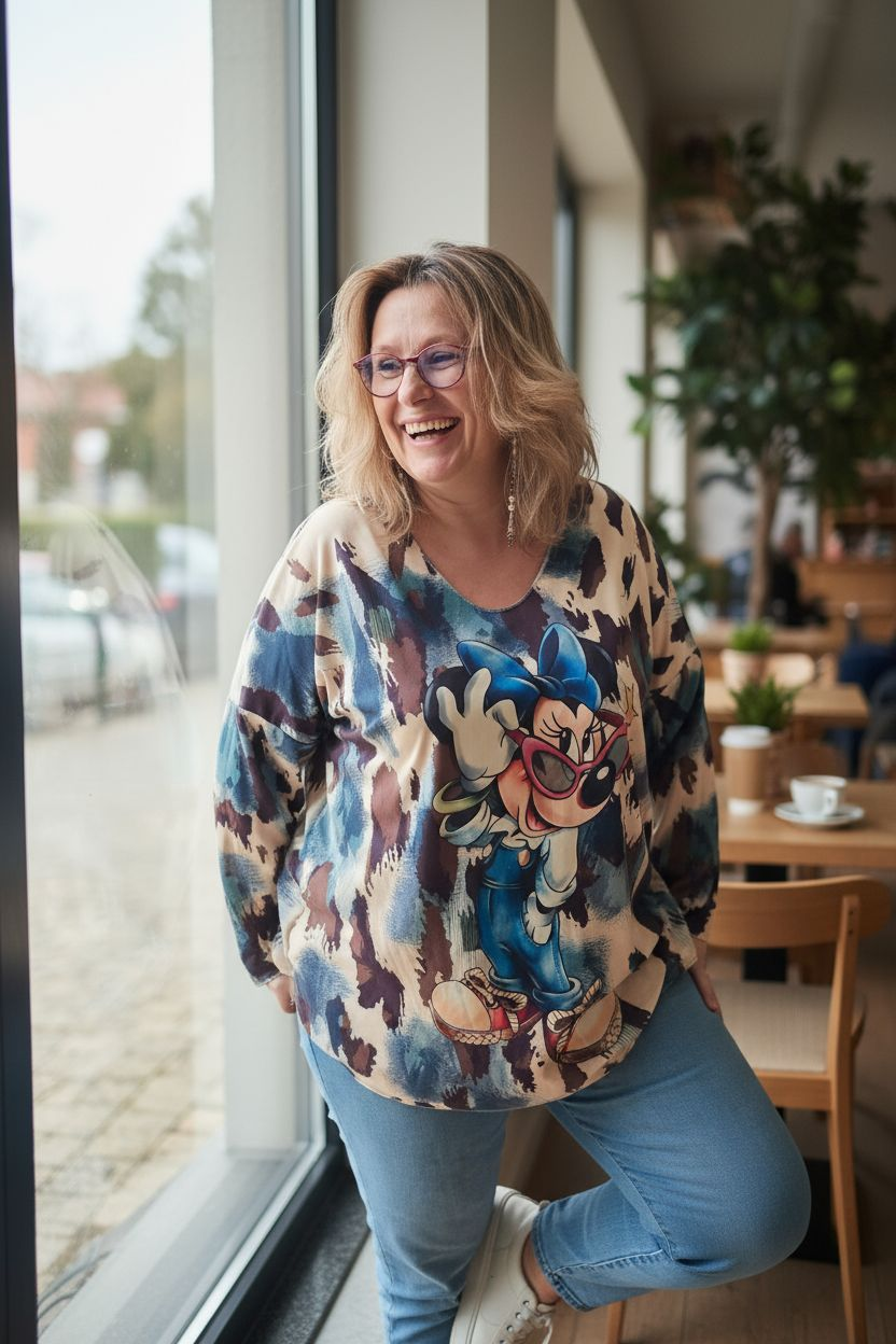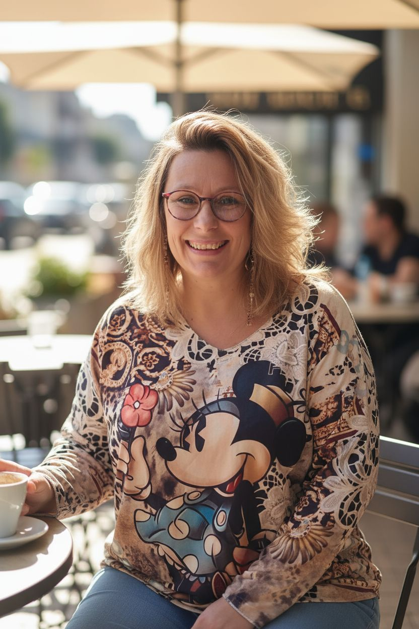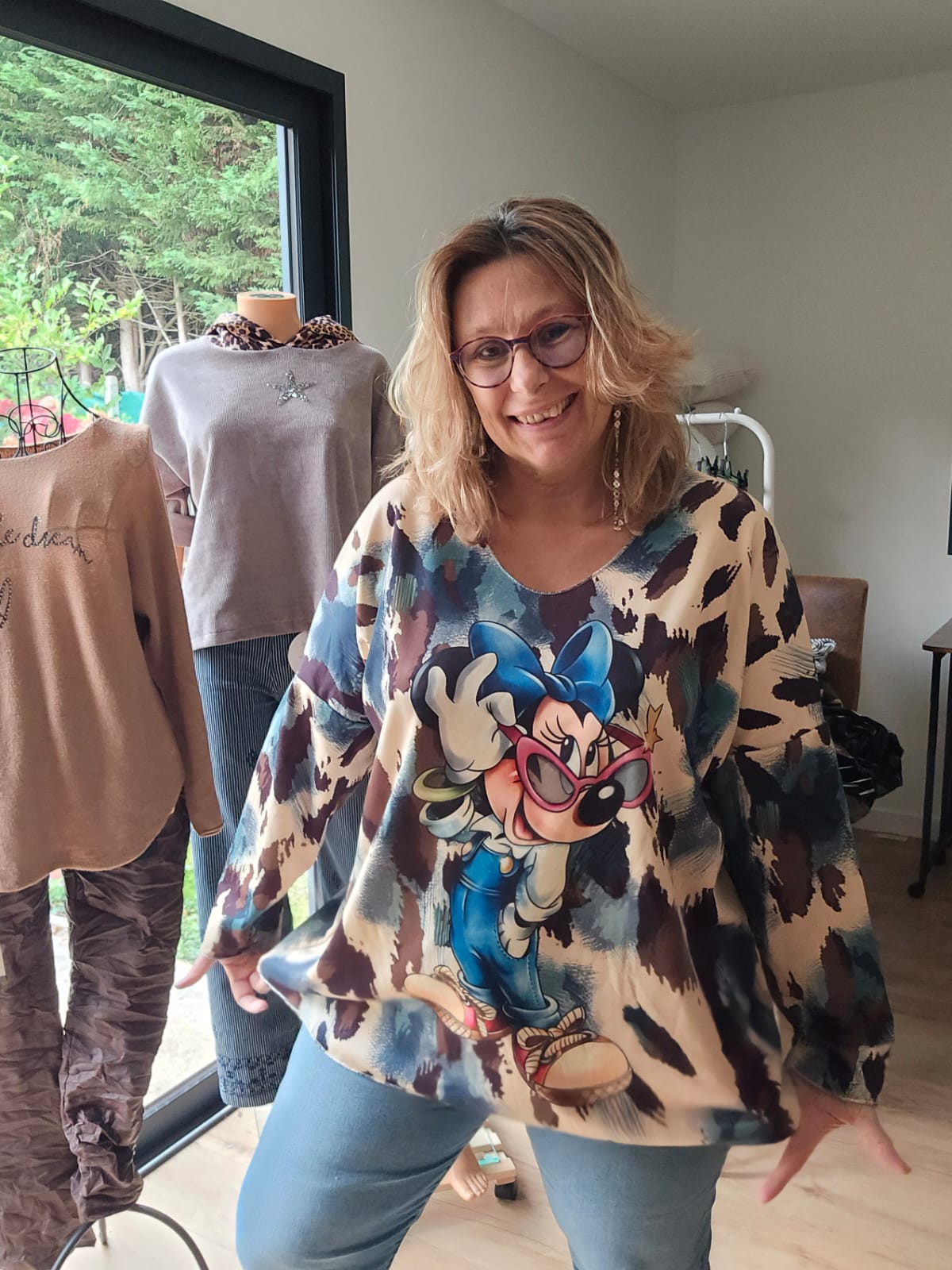 Ce top Minnie est bien plus qu’un simple vêtement : c’est une pièce audacieuse qui allie style graphique, matières douces, et confort italien. Voici ce qui le rend irrésistible :
