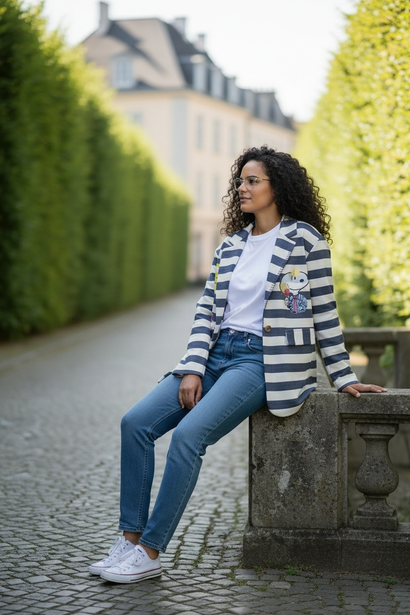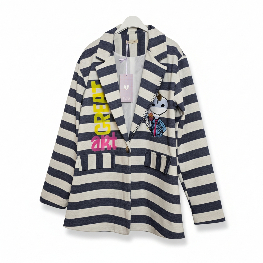 Un blazer qui combine l’élégance des rayures marines et l’audace d’un imprimé artistique.